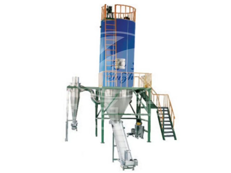 洁净空气加热后进入干燥塔,在塔内热风中用二流体(或三流体)喷嘴将各种料液物化成微小液滴,与热风进行快速热交换,蒸发掉液料中的水份(或溶剂),并随热风排出,得到粉状产品。