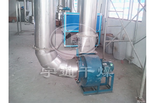 空气经过滤和加热,进入干燥器顶部空气分配器,热空气呈螺旋状均匀地进入干燥室。料液经塔体顶部的高速离心雾化器,(旋转)喷雾成极细微的雾状液珠,与热空气并流接触在极短的时间内可干燥为成品。成品连续地由干燥塔底部和旋风分离器中输出,废气由风机排空。