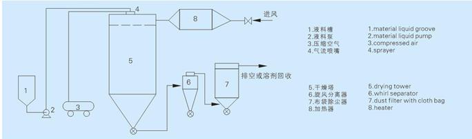洁净空气加热后进入干燥塔,在塔内热风中用二流体(或三流体)喷嘴将各种料液物化成微小液滴,与热风进行快速热交换,蒸发掉液料中的水份(或溶剂),并随热风排出,得到粉状产品。