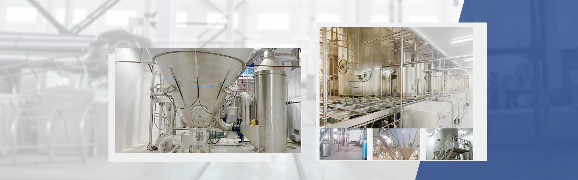 被干燥的物料随高速高温气流进入旋风分离器,此时95%以上的物料被分离下沉进入集料仓,剩余的少量物料随气流进入脉冲布袋除尘器。气流由滤袋外部进入,过滤后向上排出,为防止滤袋积料,由脉冲电磁阀定时,轮流由各滤袋上部输入压缩空气反吹滤袋,物料的收率可达到99.5%以上。